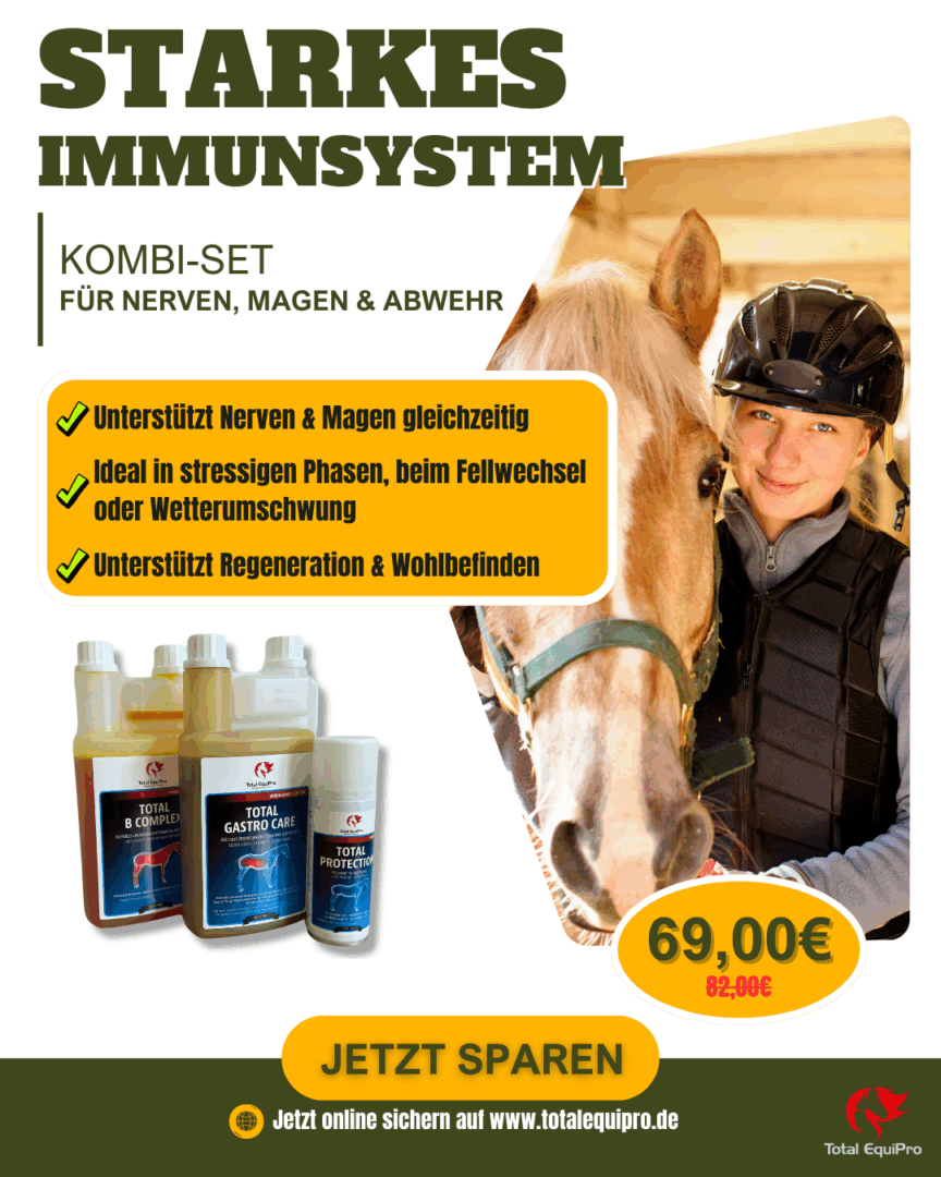 Immunsystem Pferd stärken – mit diesem hochwertigen Kombi-Set gibst du deinem Pferd gezielt Unterstützung in stressigen Zeiten, bei Wetterumschwung oder zur Regeneration. Die enthaltenen Produkte TOTAL B Complex, TOTAL Gastro Care und TOTAL Protection fördern Nervenstärke, Magenbalance und die körpereigenen Abwehrkräfte – ganz ohne Belastung.